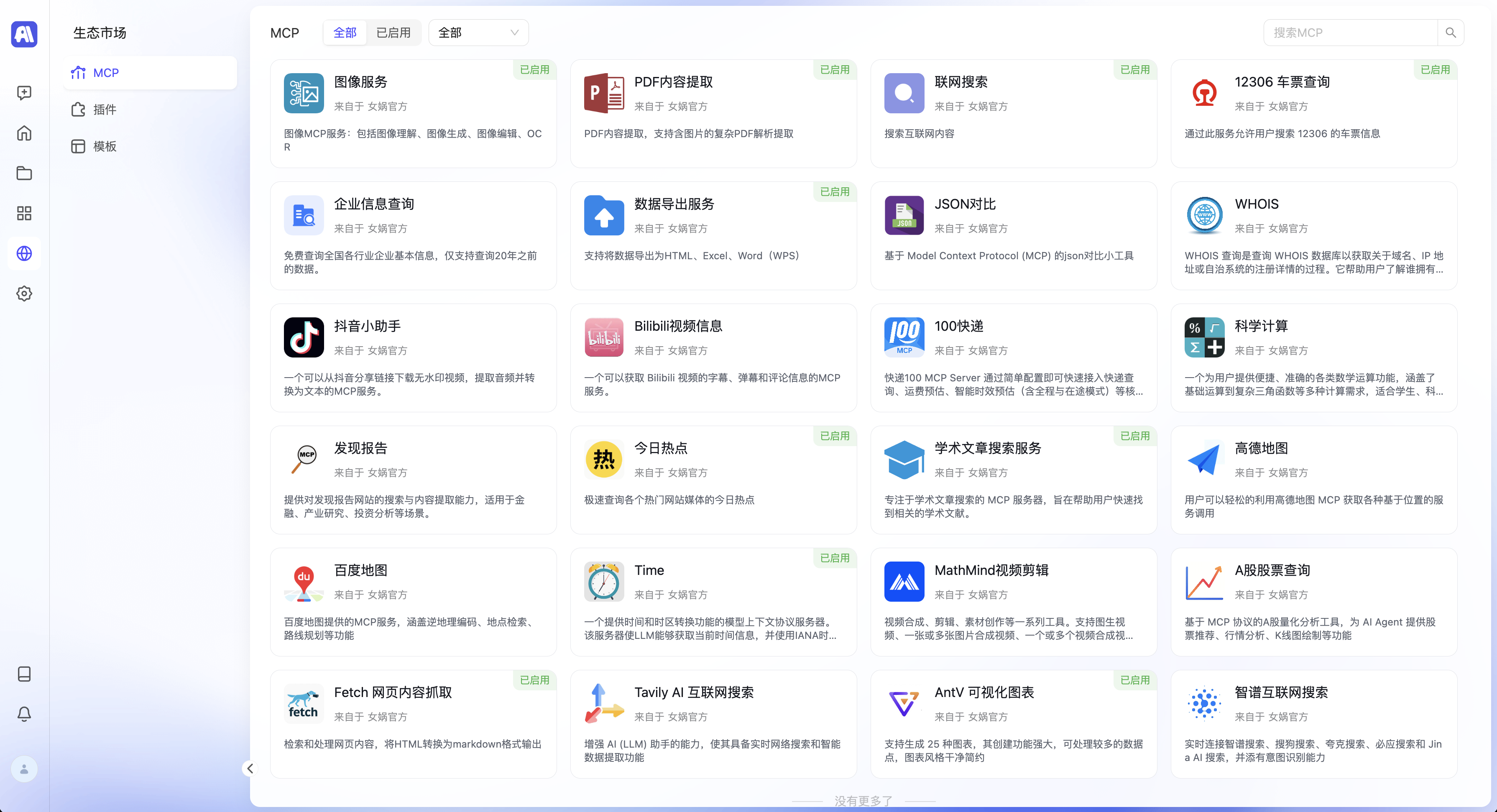 接入MCP扩展无限可能,不仅可以使用市面上的MCP,同时支持MCP的开发,你可以把它作为一个MCP的开发平台,现有接口的转换器。
